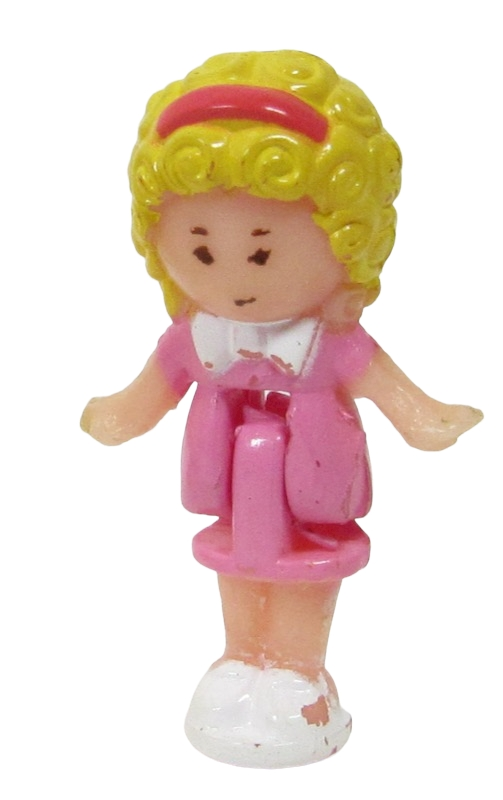 • Polly Pocket, blond short curly hair, red hair band, pink short-sleeved dress with white bow tie, white shoes, white base (undated)