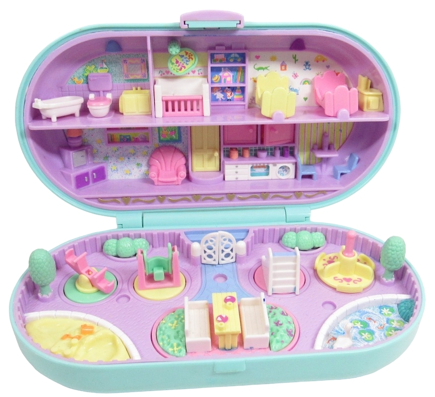 - Polly Pocket, blonde waved hair with light purple hair band, light blue long-sleeved dress with buttons, white collar, pink shoes (1994)