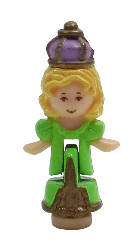 Polly Pocket, blond waved hair, gold and purple Crown on top of head, long green dress with short puffed sleeves and gold front inset and skirt bottom trim, gold shoes, tan base (1994)